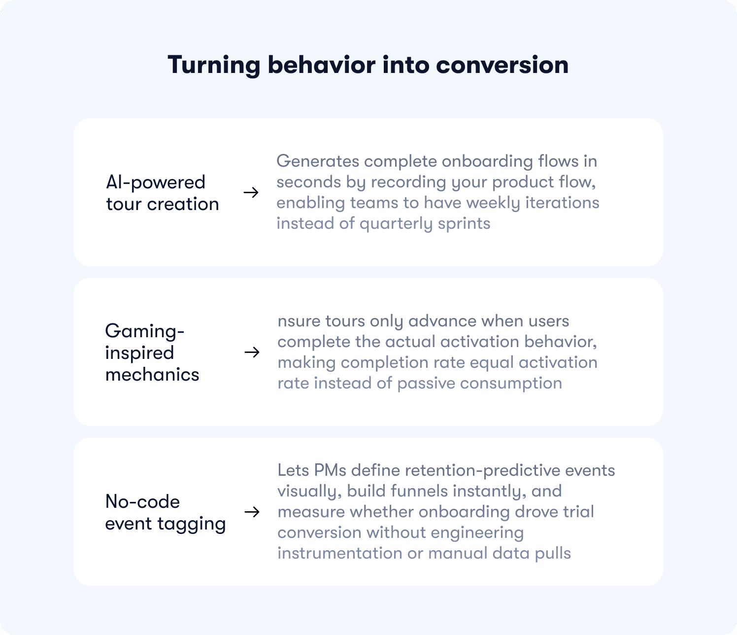 Most platforms report tour completion rates. That metric is meaningless if completers don’t reach the activation behaviors that predict retention. The platform should let you define retention-predictive events and measure whether user onboarding drives users to those specific actions.